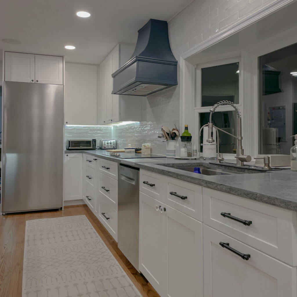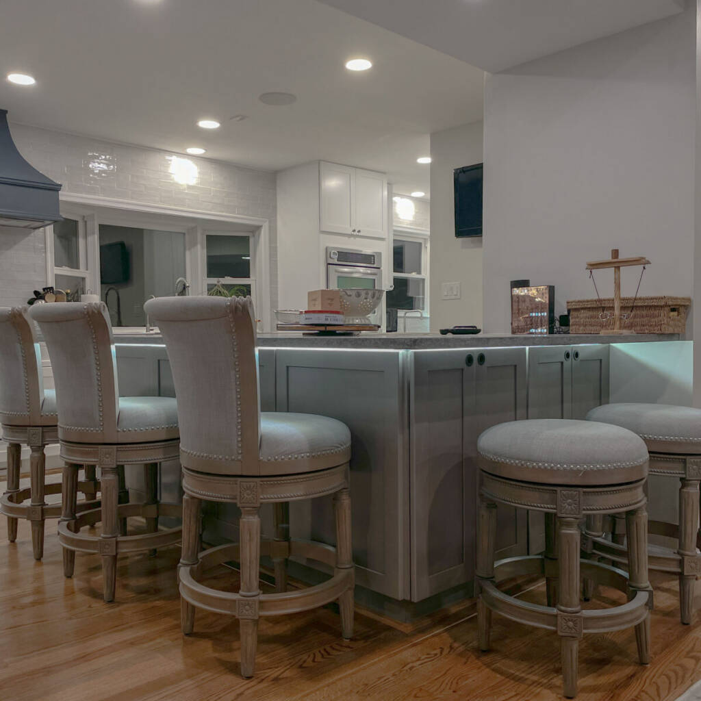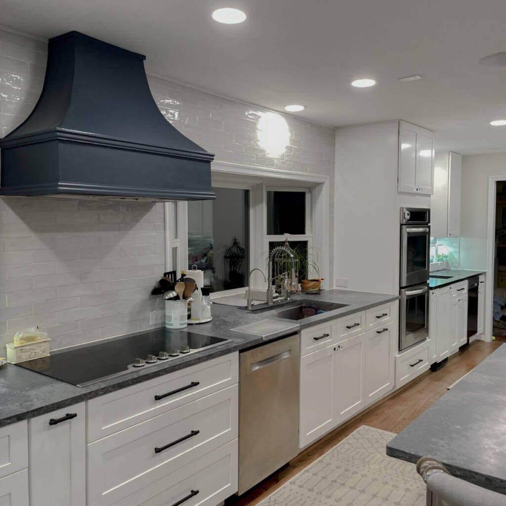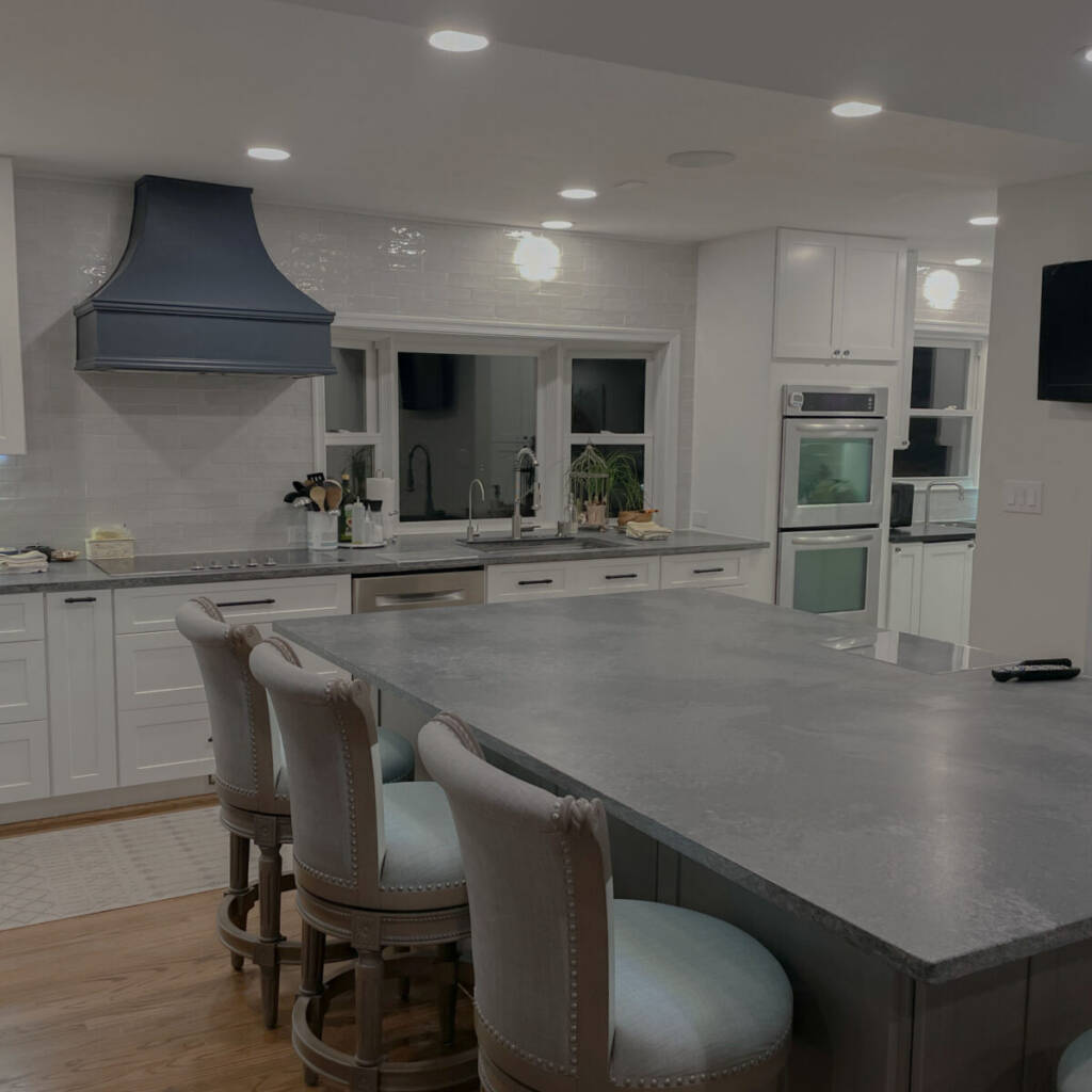 To accomplish this, the project required removing a major structural wall running through the middle of the house, dramatically expanding the kitchen footprint to approximately 350 square feet. The renovation also included updating the home’s mechanical systems, improving insulation, upgrading lighting, and refinishing the surrounding living areas to create a cohesive first-floor transformation.