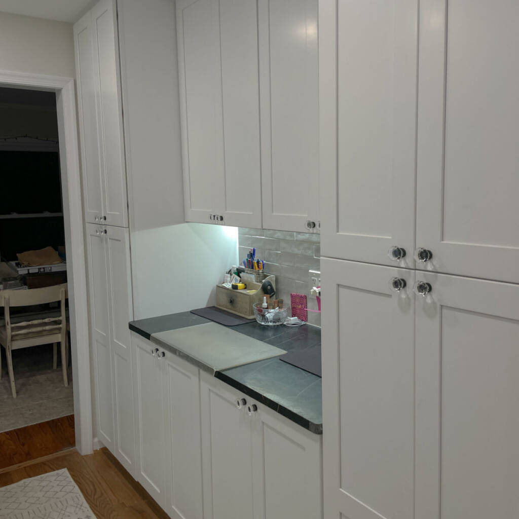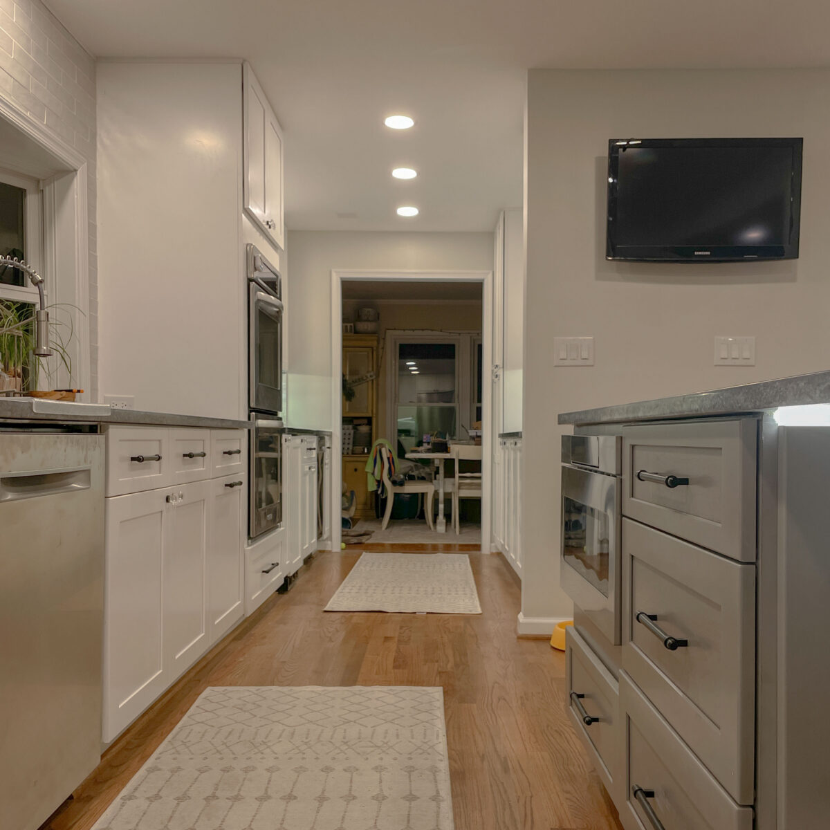 The finished result is a bright, open kitchen with a continuous wall of cabinetry and tile, a large island for gathering, and improved connection between the kitchen, dining, and living areas.